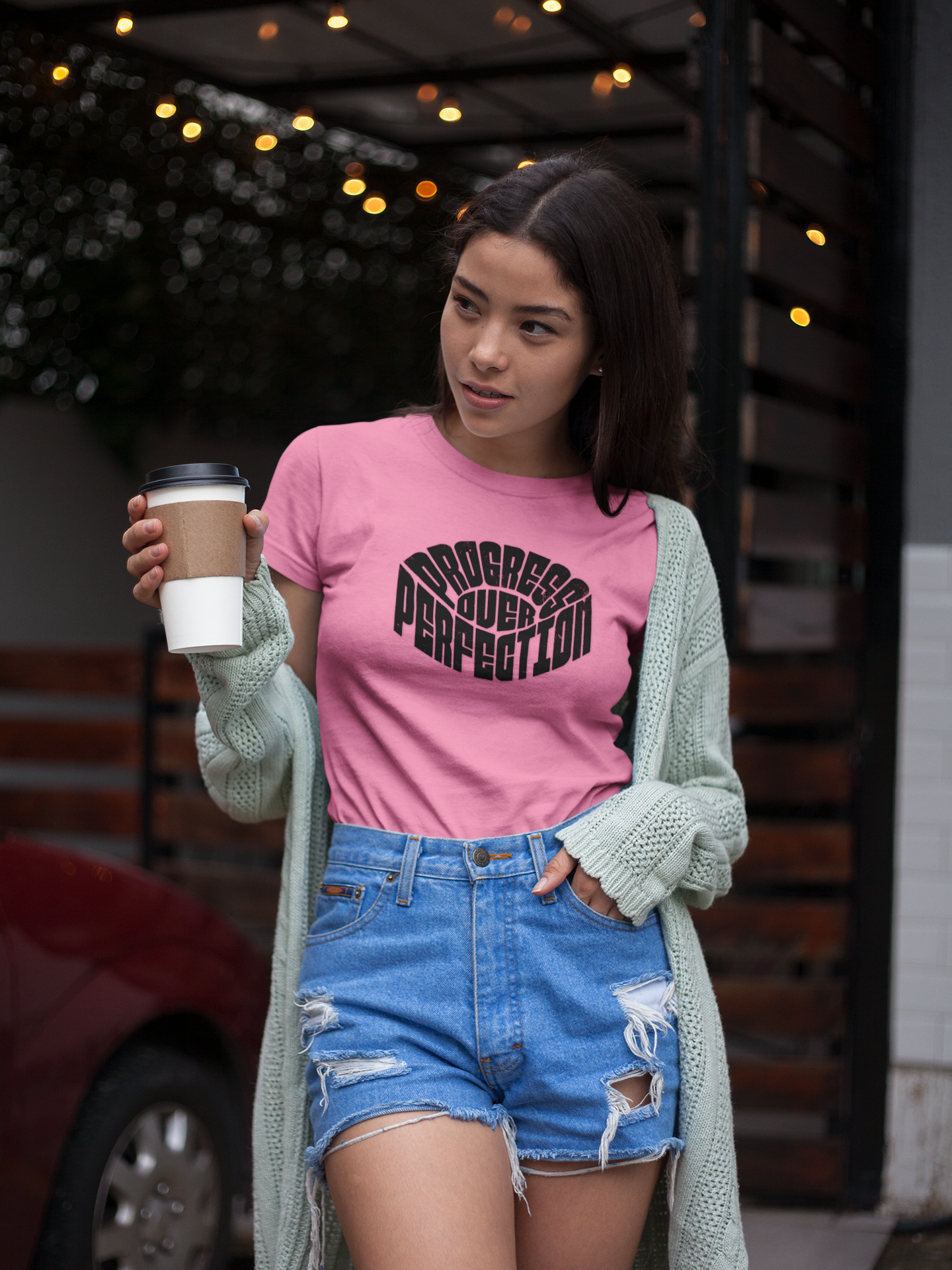 This T-Shirt with the design 'progress over perfection' exudes a positive and motivational vibe, perfect for those who appreciate personal growth and self-improvement. It is ideal for casual wear or as a comfortable statement piece. Relevant for occasions like birthdays, graduations, and everyday wear.